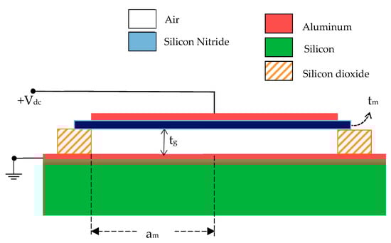 Figure 1 depicts the two-dimensional structure of the CMUT that was taken into consideration for this investigation. It consists of an aluminum (Al) top electrode on a thin movable membrane of Si3N4. The properties, such as low density, high resistance for thermal shock, wear and oxidation, along with the substantial fracture toughness and temperature strength, inspired us to choose Si3N4 as the vibrating membrane material of the transducer. The membrane is placed above a heavily doped silicon substrate separated by a small air gap forming a capacitor. The layer of metallic Al is deposited over this substrate to act as the ground electrode. The wall of the air gap is made up of the insulator SiO2.
