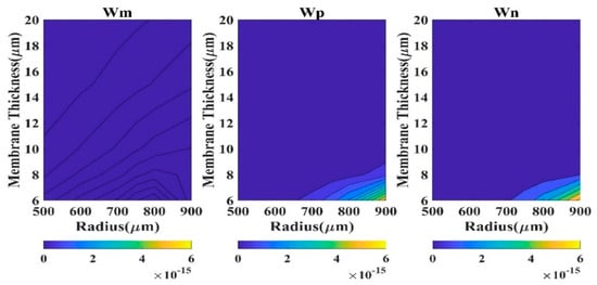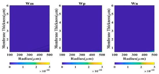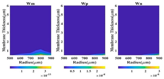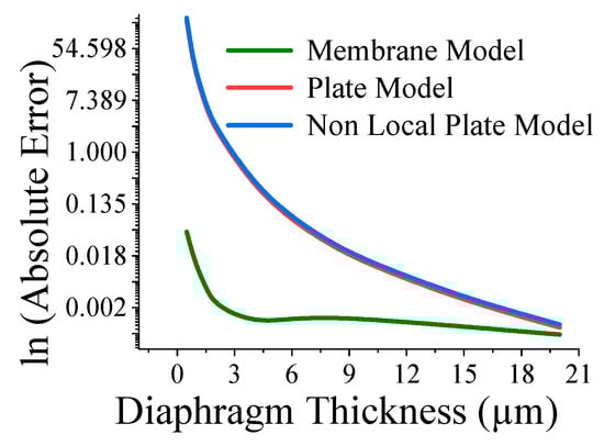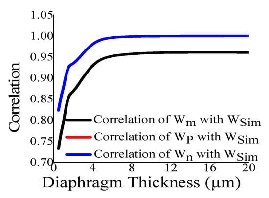 Here, the closeness of the displacement predicted by the mathematical model and the simulation has also been studied. It is reasonable for tm > 4 µm (Figure 11) and am < 700 µm (Figure 12). The variations of correlation of Wn and Wp in Figure 11 and Figure 12 are identical, and thus overlapped. The variations of absolute error of displacement at the center of the diaphragm with varying radii are depicted in (Figure 13, Figure 14, Figure 15 and Figure 16) for various membrane thicknesses. Similarly, the variations of the logarithm of absolute error with various thicknesses are represented in (Figure 17, Figure 18 and Figure 19) for am as equal to 100 µm, 500 µm, and 900 µm. This absolute deviation analysis has also established that when the diaphragm thickness is small (tm < 10 µm) and radius is large (am > 500 µm), the outputs of plate models significantly deviate with respect to the COMSOL outputs, though the membrane model performs well.