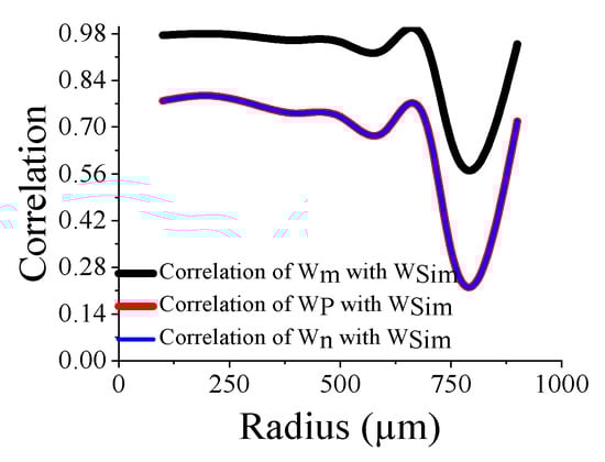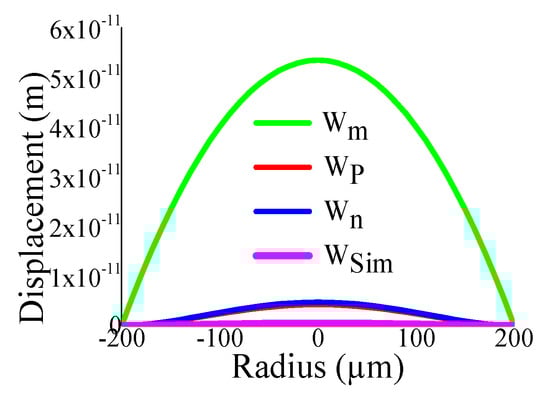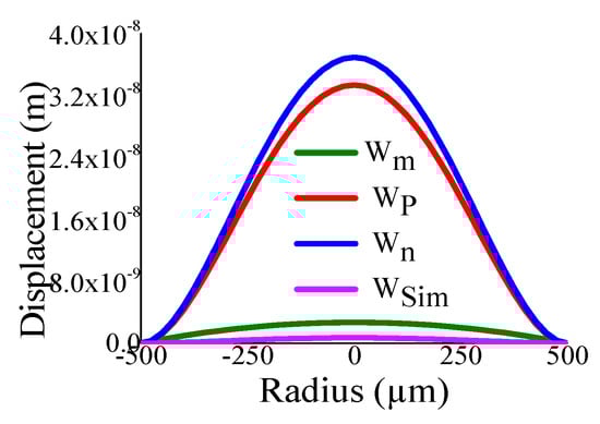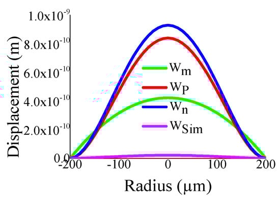 Some of the displacement profiles have been shown in (Figure 7, Figure 8, Figure 9 and Figure 10), where Wm, Wp, and Wn represent the outputs of the membrane, plate, and non-local plate models, while Wsim presents the COMSOL outcome for the applied DC bias Vdc = 40 V and CMUT air gap thickness tg = 11.2 µm. It is interesting to observe that the performance of plate models is better than the membrane model for tm > 15 µm, while the membrane model is preferred at tm > 5 µm.