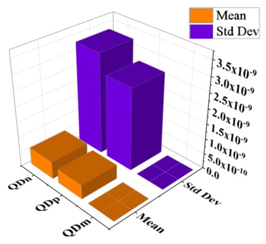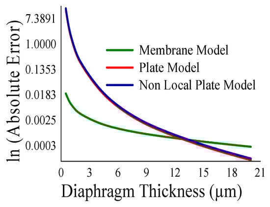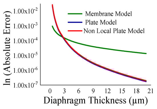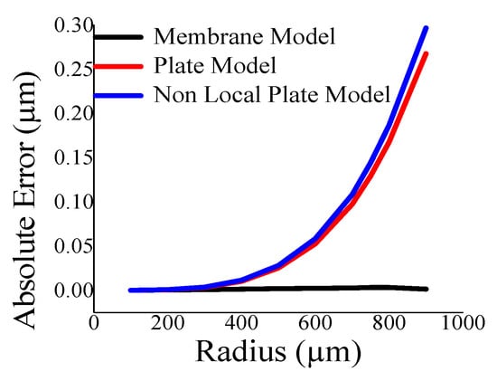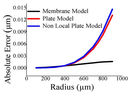 Figure 17, Figure 18 and Figure 19 show that the variations of absolute error of the non-local plate model exactly follow the pattern of the plate model. Therefore, it is difficult to distinguish them in graphs. With an increase in the membrane thickness, the performances of the plate models improve substantially, and for CMUT dimension of small radius, they become superior to the membrane model. To quantify, comprehend, and summarize the performance of these models region-wise, overall, the mean () and standard deviation of QD () is estimated as presented in Table 3. In each and every case, plate models are inferior to the membrane model, while the general plate model is better than the non-local plate version. The summary of the overall performance of the models is exhibited in Figure 20.