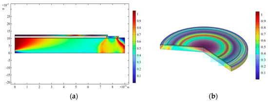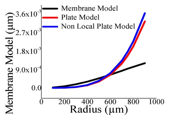 To understand the efficacy of a theoretical model in determining the displacement profile of the CMUT, a wide range of diaphragm radii (100 μm to 900 μm) and thicknesses (0.5 μm to 20 μm) are considered in the present study, and the results are compared with the COMSOL outputs (Figure 2) employing various statistical measures. All the calculations are carried out at the applied DC bias of 40 V. The high dimension of the diaphragm and high electrostatic load does not cause the compromise of aging of the device.