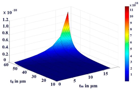 The 3D plot of pressure profile Ψ with variation of tm and tg at R = 0 for am = 750 μm and Vdc = 40 V in membrane model.