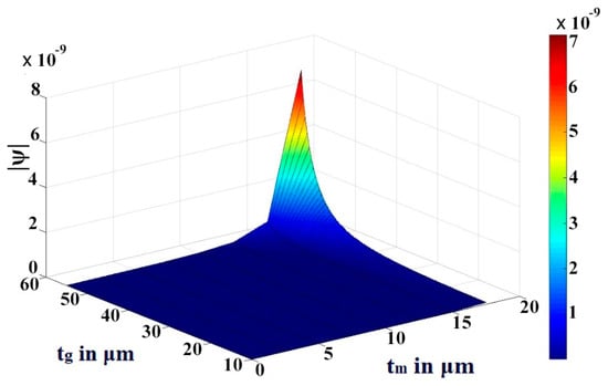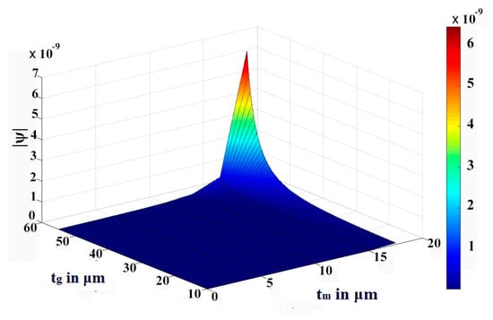 The 3D plot of pressure profile Ψ with variation of tm and tg at R = 0 for am = 750 μm and Vdc = 40 V in non-local plate model.
