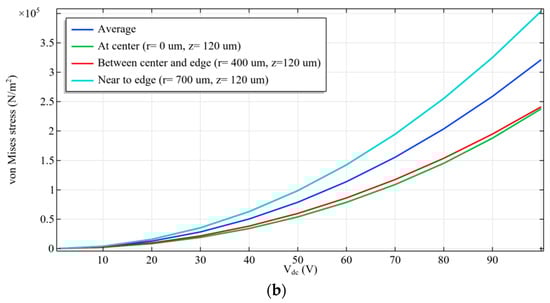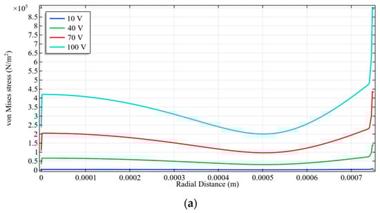 Variation of simulated von Mises stress (a) with radial distance for am = 750 μm and Vdc = 40 V (b) stress with DC bias for am = 750 μm.
