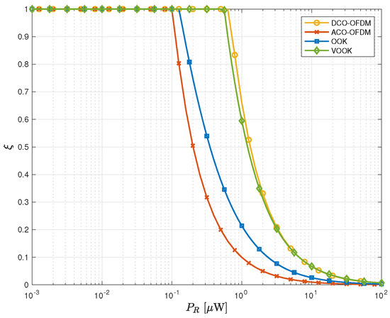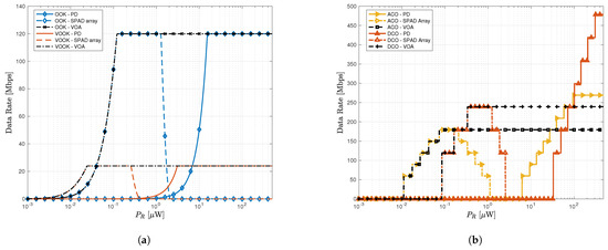 Figure 5a,b plots the achievable data rate versus the received signal power for a dimming factor , background power nW and BER target for the studied modulation methods. It should be noted that a vector of QAM modulation order is used to attain the O-OFDM data rate results. The BERs for each when different modulation schemes are used are computed using (10), (15), (17), (24), and (55), and the maximum spectral efficiency with a BER smaller than is noted.