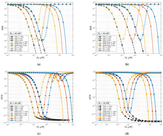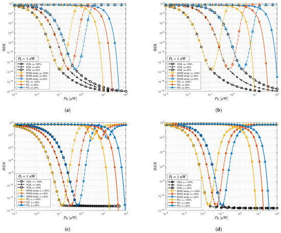 The BER plots of OOK-, VOOK-, DCO-OFDM-, and ACO-OFDM-modulated signals are shown in Figure 3a–d for three dimming levels versus the received signal power, considering the higher background light power of nW. The sensitivity of the SPAD detector (dash-dotted curves) is significantly higher than that of the PIN PD detector (solid curves). However, as increases (e.g., due to the user’s location/orientation towards the LED), the BER of the original SPAD array receiver initially decreases and then increases due to dead-time-induced non-linear distortion caused by SPAD’s saturation. This indicates the advantage of using VOA in the proposed adaptive receiver. All the considered modulation techniques exhibit improved overall performance and effectively mitigate non-linear distortion when VOA implementation with optimal transmittance (dashed curves) is used. For instance, for and W, the traditional OOK SPAD array achieves a BER of , however, our VOA implementation lets the SPAD array to perform at a BER = . The VOA receiver for VOOK in Figure 3b shows a similar trend, but compared with OOK, it achieves a BER = at W. This also shows how VOOK is not power efficient at such dimming levels.