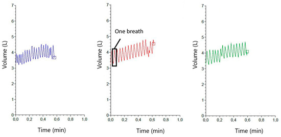 The application of the IOS to the head of a calf is shown in Figure 2. The technical design of this device and the careful evaluation of pulmonary function testing in this animal species have been described elsewhere [26,27]. For IOS data, a heated pneumotachograph (Lilly-type, mesh resistance: 36 Pa L−1 s) connected to a differential pressure transducer (SensorTechnics SLP 004D, Puchheim, Germany) ensured continuous measurement of airflow. At flow rates < 15 L s−1, the pneumotachograph is linear within 2%. Volume was gained from the flow signal by calculating an integral from airflow during each inspiration or expiration. The results are given as volume curves over time (Figure 3). Three consecutive measurements were registered per calf per day (each included at least 10 regular breathing cycles free of artifacts) lasting on average 24 s per measurement. The number of measurements was based on previous performed studies with the IOS in calves [21]. Read-out variables were: RR (IOS), Vt (IOS), and the minute volume of respiration (Vmin (IOS)) calculated with the formula: