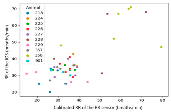Since the RR sensor uses a different algorithm of measurement, which likely causes a systematic mistake in the results, the systematic mistake was removed by performing a sensor calibration. This mistake can be easily found in the plots with raw results (Figure 7, Figure 8, Figure 9, Figure 10, Figure 11 and Figure 12). The observations, taken from the same animal, however, were slightly moved along one of the axes (along RR or IOS sensor), which gave an idea of a systematic mistake in the device. Therefore, an individual correction factor based on the mean values across the two days of observation was calculated to remove the systematic mistake [35]. For example, if the mean values across one calf were equal to 25 bpm in the RR sensor and 27 bpm in the IOS sensor, for this calf, the correction factor was 25/27, which is approximately 0.93. Then, in all the RR observations from the RR sensor, we would multiply the raw RR values by 0.93, and this new value is calibrated. We applied the same procedure to each measured parameter.