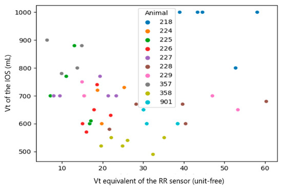 Scatter diagram showing the tidal volume (Vt) measured by the IOS and the raw Vt equivalent of the RR sensor (n = 46). The data of the individual calves are marked with different colors.