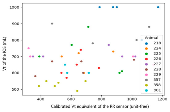 The calf’s recorded RR was similar for both devices ranging between 19 and 82 bpm, while the Vt of the IOS varied from 6.64 mL/kg to 14.29 mL/kg body mass and the Vt equivalent of the RR sensor ranged from 6 to 60 (an equivalent is unit-free) (Table 1). After the calibration process, the range of the RR sensor values was closer to the values of the IOS and therefore, better comparable to each other.