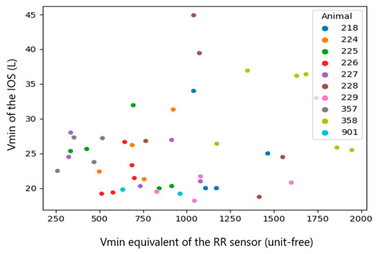 A correlation between the raw data of both measurement systems was not visible (Spearman correlation coefficient (CC): 0.1~0.37). However, once we added the information about systematic mistakes in the RR sensor (calibration), the correlation in RR and Vt became clearer across the whole dataset without extracting medians from them (Table 3, all observations, Spearman CC: 0.2~0.48). The most obvious correlations were found in medians per animal (Spearman CC > 0.9, p-value < 0.05 in RR and Vt). However, in Vmin, the p-value did not provide statistical significance (p-value > 0.05) [38].