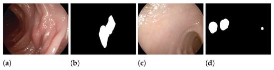 Colon polyps are among the preliminary manifestations of colorectal cancer, one of the cancers with the highest incidence [1]. The identification of precancerous polyps is essential during screening, as early detection and accurate diagnosis are the keys to effective treatment and low mortality [2]. Each 1% increase in polyp detection reduces the incidence of colon cancer by approximately 3% [3]. Currently, colonoscopy is the gold standard adopted in clinical practice to detect diseased tissue in the gastrointestinal tract. However, the accuracy of the actual match depends on the physician’s skill and requires a great deal of effort. Therefore, for the clinical prevention of colorectal cancer, it is crucial to have automatic methods that can point out all existing polyps with high accuracy. Artificial intelligence and machine learning models have been widely applied to the semantic segmentation of polyps in medical images. Two examples of colonoscopy images of polyps and their segmentations are shown in Figure 1.