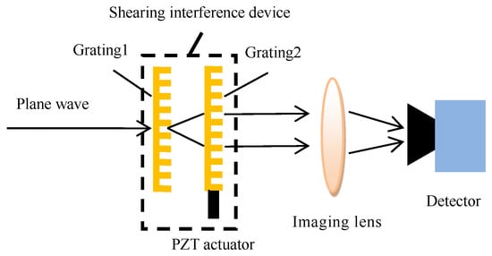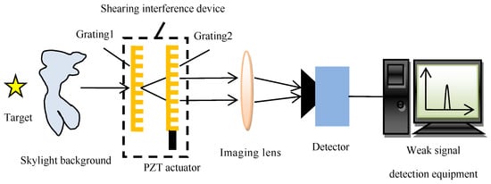 The shearing interference detection technique takes advantage of the fact that the far-field coherence of the small-scale target is better than that of the large-scale skylight background, which is described by the Van Cittert–Zernike principle [15]. The conceptual diagram of the new type of shearing interference detection system is shown in Figure 1. The main difference in the structure scheme between this new-type detection system and the published shearing interference detection system is that the new system replaces the beam-shrinking telescope (meaning the pupil plane detection) with the imaging lens (meaning the image plane detection, which is the same as the application mode of the traditional optical detection system) so that the simultaneous detection of multiple targets in the field of view can be realized and the influence of stray lights in the pupil plane can also be suppressed. The small-scale target can form the interference field that changes periodically with time in the pupil plane by phase modulation, which is realized by transversely moving one of the gratings respective to the other, while the large-scale skylight background can hardly interfere. The interference field in the pupil plane is transformed into a small light spot (covering several pixels) in the image plane by the imaging lens, and the light spot intensity also changes periodically with time. The periodically changing spot intensity is converted into a periodic electrical signal by the array detector. The periodic target light signals can be extracted from the random skylight background noises by using the weak signal detection technique [16,17]. This technique can detect the sinusoidal signal with a very low SNR (even less than one). Therefore, in principle, the new type of shearing interference detection system can detect the target with a very low SNR to realize the detection of dim and weak targets in the strong skylight background.