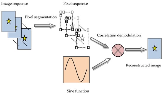 By using the mathematical models of shearing interference and phase modulation described in Section 2.1, it is possible to generate an image sequence that includes the characteristics of the periodic variation over time of the target light intensity in the image plane. The pixels of the array detector corresponding to the positions of the target image can detect the periodic modulation characteristics of the target light intensity. The periodic modulation of light intensity can be considered as moving the target light intensity from zero frequency in the time-frequency domain (generally, the light intensity of a constant light-emitting body can be considered as direct current or zero-frequency modulation) to a higher frequency, thereby significantly separating it from the background light (mainly concentrated near zero frequency). Because the modulation is periodic and the frequency is known, such as the sinusoidal modulation, it is possible to divide the collected image sequence with multiple periods into many temporal data sequences corresponding to the pixels of the array detector and then demodulate each temporal data sequence separately. Finally, the demodulated values are reconstructed into an image based on the positions of the corresponding pixels in the array detector plane, which is the reconstructed image of the new type of SIDS. The above image reconstruction process is shown in Figure 2.