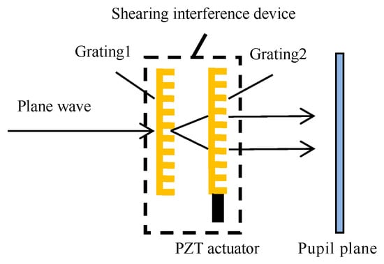 To avoid the above problems, the interference detection technique [7,8,9,10] has been proposed to improve the detection performance for finding dark stars. The interference detection technique uses the discrepancy of the far-field coherence between the target light and the skylight background to realize the separation of the two. It adopts a new light field characteristic independent of the traditional noise suppression methods, which do not conflict with the traditional ones. Therefore, the interference detection technique can be used alone to suppress the skylight background, or it can also be combined with traditional methods to achieve better suppression ability. Due to the shortcomings of the low interference contrast of target light and the low aperture utilization of the early interference detection technique based on electro-optic modulation devices [7], a shearing interference detection technique based on the double-grating structure [11,12,13,14] was proposed [10], which can significantly improve the interference contrast of target light and increase the aperture utilization. However, the published scheme of the shearing interference detection technique [10] uses a beam-shrinking telescope to reduce the interference fringe area and improve the fringe contrast. The beam-shrinking telescope realizes pupil transformation and reduces the large pupil to the small pupil. In essence, the published scheme only realizes pupil plane detection. It is difficult to distinguish the overlapping light field of different targets on the pupil plane. The image points of different targets can be transformed to the different positions on the image plane by the imaging lens (realizing the Fourier transform). Therefore, most of the traditional detection systems based on the principle of geometric optics utilize image plane detection. If shearing interference detection wants to achieve multi-target detection, it must also utilize image plane detection. The published shearing interference detection scheme [10] obviously cannot achieve image plane detection, and the conclusion of improving the detection SNR is also aimed at pupil plane detection.