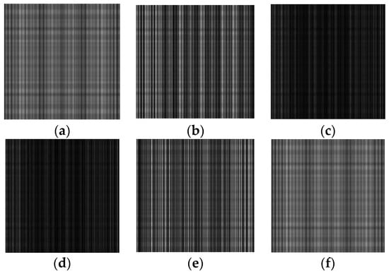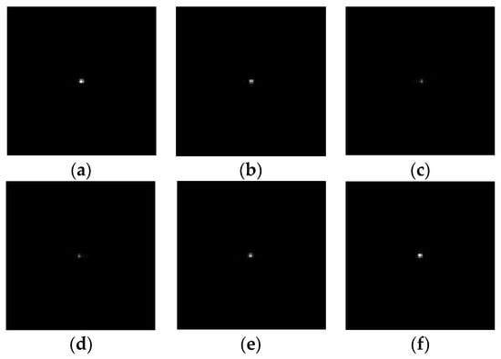 The simulation results of the variation of the target image brightness within a modulation period formed in the image plane. (a–f) are the results according to different moments of the modulation period (0, 0.2, 0.4, 0.6, 0.8, and 1 period, respectively).