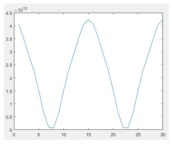 The pixel corresponding to the highlight position of the target image generated by the simulation of the new type of SIDS was chosen, the corresponding gray values of the pixel during two modulation cycles were obtained, and then the curve of the gray values of this pixel was drawn in Figure 8. As can be seen from Figure 8, after the target light undergoes the shearing interference and the periodic phase modulation, the image spot intensity formed in the image plane undergoes a periodic change similar to the sinusoidal curve. As the background light does not interfere in theory, it does not produce periodic changes in the light intensity in the image plane. The discrepancy between the target light and the background light can be generated by the shearing interference and the phase modulation, and then the dim target can be extracted from the scene covered by background noises utilizing the weak signal demodulation technique. The performance simulation of the new type of SIDS with background noises will be described in the next section.