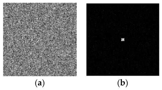 The simulation generated a noisy modulated target image sequence with 1500 frames (corresponding to 100 modulation cycles). The first brightest target image in the modulated target image sequence is shown in Figure 9a. As can be seen from Figure 9a, due to the extremely low signal-to-noise ratio (about 1), the target cannot be found in a single frame image. The image reconstructed from the above image sequence by using the interference detection technique is shown in Figure 9b. As can be seen from Figure 9b, the interference detection technique can effectively suppress the background noises and generate the image with a very dark background, making it easy to detect the dim target (SNR = 16.9312).