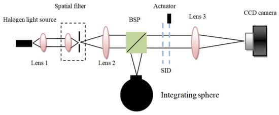 The experimental scheme of the new type of shearing interference detection system is shown in Figure 11. In Figure 11, the optical layout mainly includes four parts, which are the target light simulator, the skylight background simulator, the SID, and the traditional detection system. The white light point target simulator is composed of the halogen lamp (Daheng Optics, Beijing, China, GCI-060101), lens 1 (Daheng Optics, GCL-010104), and the spatial filter (Newport Model 900) to generate the target light of which the diameter of the far-field coherent area is nearly equal to the diameter of the system optical path. Lens 2 (Daheng Optics GCL-010650) collimates the target light into the plane wave to simulate the target at a far distance. The integrating sphere will produce nearly uniform stray light to simulate the characteristics of the skylight background. The target light and the stray light are combined by the beam split prism (BSP, Daheng Optics GCC-403102) to simulate a situation in which the target light is covered by the skylight background. The SID composed of two gratings and one actuator can split the combined lights from the BSP into two transverse shearing beams. The gratings of the SID are two identical Ronchi phase gratings (HOMO GS-2-532-50U). One side of the second grating is connected with the actuator (Core Morrow, Harbin, China, P66) to realize the linear periodic back-and-forth motion. Because the transverse displacement of the two shearing beams is far less than the far-field coherent region of the target light, the two shearing beams from the target light can form a nearly ideal interference field. The two shearing beams are parallel plane waves, so the intensity distribution of the interference field is uniform. When the actuator moves back and forth, the intensity of the interference field will change periodically. After the SID, there is the traditional detection system, which is composed of lens 3 and the CCD camera. Lens 3 (Daheng Optics GCL-010111) focuses the interference field energy to the small size spot on the CCD camera (Basler piA1600-35gm). The CCD camera can receive serial image frames, which include the modulated information of the target light. By the signal demodulation method (such as the Fourier transform of time series data for each pixel in the camera), the reconstructed image of the shearing interference detection system can be obtained. The experimental setups of the new type of detection system are shown in Figure 12.