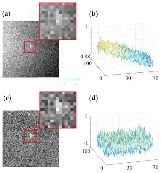The single-frame raw image and the single-frame image with background fitting subtraction are shown in Figure 13. It can be seen in Figure 13 that there is a slope structure (structural noise) in the background of Figure 13b, which can be eliminated by the background fitting subtraction method (almost no slope structure in Figure 13d). The image SNR in Figure 13c (about 4.4) is larger than that in Figure 13a (about 2.9), which illustrates that structural noise is the major noise in raw images that can be eliminated by the background fitting subtraction method.