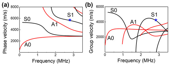 Dispersion curves of an aluminum alloy plate with a thickness of 1.6 mm, phase velocity (a) and group velocity (b) versus frequency.