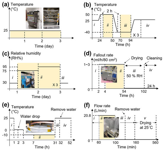Graphs showing testing conditions in various environments referring to the US Standard MIL-STD 810H, for the (a) temperature stability, (b) combined temperature: (i) an initial step at room temperature, (ii) 50 °C, (iii) −40 °C, and (iv) final step, (c) humidity: (i) an initial step at 30RH%, (ii) 75, and 95 RH%, and (iii) final step at 30 RH%, (d) salt fog: (i) an initial step, (ii) during salt fog, (iii) drying step after stop salt fog, and (iv) drying step after cleaning salt crystals on plate, (e) icing: (i) an initial step, (ii) formation step of icing, (iii) increasing temperature, and (iv) after removal of the water on the plate, and (f) rain tests: (i) initial step, (ii) during water flow, (iii) no water flow, (iv) removal of water, and (v) drying. Colored regions indicate the duration of each environmental test.