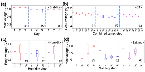 Sets of boxplot for each of test coupons (#1, #2, and #3) showing the ultrasonic peak voltage obtained at each stage for the: (a) temperature stability test, (b) combined temperature (CT) test (i: initial stage at RT, ii: high temperature, iii: low temperature, iv: final stage at RT), (c) humidity test (i: initial stage at 30 RH%, ii: humidity at 75~95 RH%, iii: final stage at 30 RH%), and (d) salt fog test (i: initial stage, ii: during salt fog, iii: dried at chamber, iv: cleaned and dried at 25 °C), box plot: box showing the mean value, 25 and 75 percent values of the total data, and two whiskers showing the minimum and maximum values.