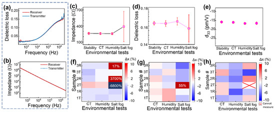(a) Dielectric loss and (b) impedance as a function of frequency measured before the stability test for P(VDF-TrFE) on receiver and transmitter sides of coupon #1; graphs showing average values of (c) impedance, (d) dielectric loss, and (e) effective d33 measured after each experimental test, and mapping showing percentage change in (f) impedance, (g) dielectric loss, and (h) effective d33 values obtained before and after the experiment for test coupons #1, #2, and #3. (CT: Combined temperature) Impedance and dielectric loss were measured at 2.8 MHz, and effective d33 was measured at 100 kHz.