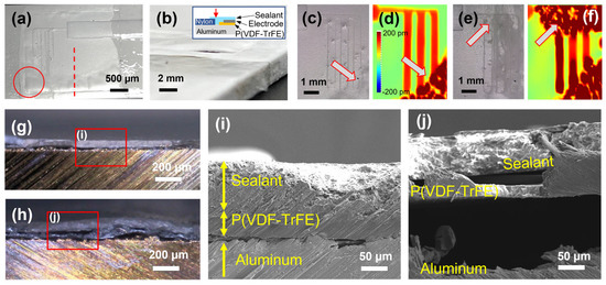 In order to examine the delamination through the cross-sectional view, coupons before and after the salt fog test were cut using a saw blade. The cutting was made around the red dashed line in Figure 6a. Figure 6g presents a cross-sectional optical image of C-Humidity, showing that P(VDF-TrFE) and sealant were well coated on the aluminum alloy. In the FESEM image in Figure 6i, P(VDF-TrFE) and sealant layers were identified, and the layers adhered well without obvious separation. This shows that these layers were not separated by the mechanical force generated from cutting with the saw blade. Figure 6h is a cross-sectional optical image of C-Saltfog, showing blisters in the P(VDF-TrFE) and sealant layers on aluminum alloy. In the enlarged FESEM image of Figure 6j, it is observed that the layers are separated from each other. The delamination could change the piezoelectric displacement, dielectric properties, and impede the generation and detection of ultrasonic signals. Considering only one of the three coupons suffered from the failure, the delamination formed by the salt fog test might be caused by imperfect coating processing in the current transducer design rather than a material-intrinsic issue. Since this delamination started at the edge of the coupon, we believe that this issue can be sufficiently prevented by the implementation of a suitable protective layer or solved by improving the fabrication process for eliminating the defects at the edge.