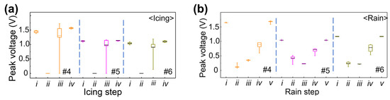 Boxplot graphs showing the mean, maximum, minimum, 25, and 75% values of the peak voltage of the ultrasonic signals at each stage of (a) icing (i: initial stage, ii: during icing, iii: melted ice, and iv: dried) and (b) rain test (i: initial stage, ii: during raining, iii: stop raining, iv: remove water, and v: dried), for test coupons #4, #5, and #6.