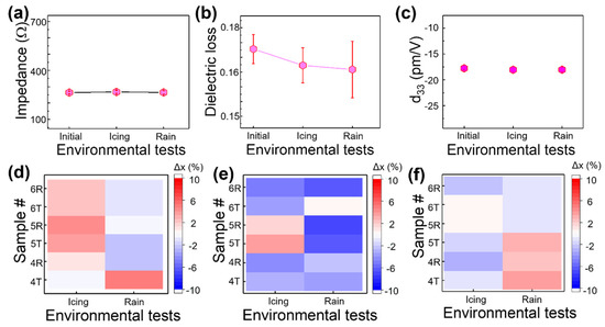 After the icing and rain exposure experiments, the average values of impedance, dielectric loss, and piezoelectric constant were measured, as shown in Figure 8a–c. The average impedance was constant at around 260 Ω. Compared to the initial, the average dielectric loss of the icing and rain test slightly decreased from 0.17 to 0.16, and the standard deviation showed an increasing trend. The average effective d33 value was almost constant at −18 pm/V. Figure 8d–f shows the percentage change of the impedance, dielectric loss, and piezoelectric coefficient for each coupon, and they had a percentage change of less than 10%, indicating that our DWTs are robust for rain and icing exposure.