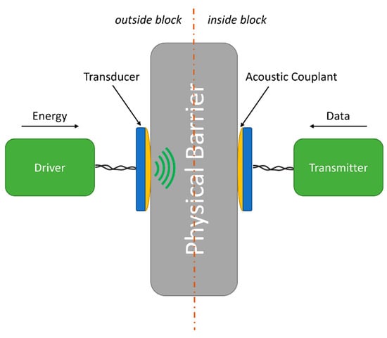 The system addressed in this paper is composed of two main blocks, namely outside and inside blocks, adopting a concept similar to that used by Shoudy et al. [14]. The former supplies energy and receives, processes and stores data coming from the latter. The inside block can include sensors whose data are transmitted to the outside block; all energy used in this block comes exclusively from the outside block. This technique allows instruments to be installed in hard-to-reach locations, enabling monitoring of environments where the direct supply of energy or even the replacement of batteries, as a source of energy, would be unfeasible [32,33,34]. The schematic diagram of the ultrasonic transception system is shown in Figure 1.