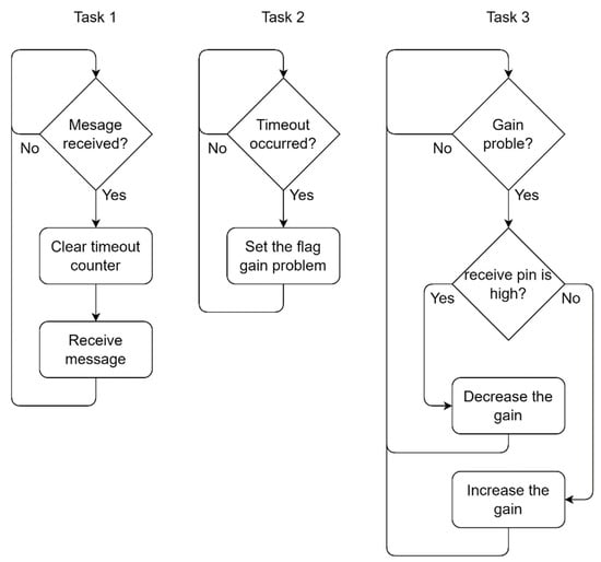 Automatic gain control algorithm tasks. Task 1 is responsible for checking if a message is received within the predefined timeout interval. Task 2 checks if a timeout occurred. Task 3 checks the Gain problem flag.