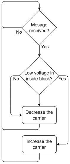 With the goal to reduce the total energy consumption of the system, an algorithm capable of automatically regulating the amplitude of the carrier that is transmitted from the outside block (active side of the system) to the inside block (passive side) was implemented. Unlike conventional systems that transmit a carrier with a fixed amplitude, which may transmit more energy than what is used [45,46] or systems that control the carrier but do not use it as a power source to other parts of the system [29,47], in the proposed system, an algorithm calculates the carrier level that will be applied to the outside block transducer as a function of the voltage level being delivered to the inside block circuitry. Within each transmitted symbol, a microcontroller in the inside block sends back, along with the transmitted data packet, the value of the supply voltage that was received. With this piece of information, the outside block can decide whether to alter the carrier level. If the voltage at the inside block is lower than expected, the outside block microcontroller increases the power of the carrier applied to the outside block transducer. In this way, the circuit always operates with a minimum energy level that ensures the supply voltage level of the inside block circuitry is stable and within established limits. A flowchart of the algorithm is shown in Figure 3.