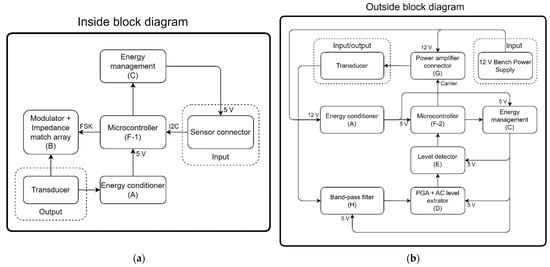 Figure 5a shows the general diagram of the inside block subcircuits. The inside block circuit operates as follows. The energy conditioner (A) is responsible for stabilizing and regulating the voltage level from the signal received at the transducer. Then, it powers the microcontroller (F-1), which activates the power level for the temperature and pressure sensor (l) through the energy manager (C). The temperature and pressure sensor (l) sends data to the microcontroller (F-1) through an I2C communication protocol. Periodically (every 500 ms), the microcontroller (F-1) sends the sensors’ data and the level of its supply voltage to the modulator (B), which applies the frequency-modulated signal to the transducer of the inside block.