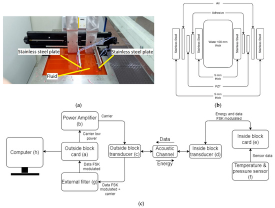 The system was experimentally assessed with the setup shown in Figure 6. The acoustic channel is composed of two 5 mm-thick stainless steel blocks with fluid in between. Both stainless steel blocks were submerged in a water recipient (LAUDA® Model Master EDITION X (LAUDA, Lauda-Königshofen, Germany)) with temperature control. The recipient was filled with PARAFLU® and distilled water mixture in a proportion of one part of coolant fluid to five parts of distilled water in order to prevent oxidation of the metallic walls, which was kept at 25 °C. Two piezoelectric ceramic transducers with dimensions of 70 mm × 25 mm × 2 mm were bonded using an Araldite epoxy adhesive from Hunstaman® (Hunstaman, The Woodlands, TX, USA) to the external surface of the steel blocks. A photograph of the setup is shown in Figure 6a and a schematic diagram illustrating the composition of each part of the acoustic channel is shown in Figure 6b. A detailed diagram with the components and connections used in the experimental setup is shown in Figure 6c. The process starts when the outside block card (a) generates the signal that drives the power amplifier (b), which is applied to the outside block transducer (c). This signal is then converted into ultrasound, which propagates within the acoustic channel. The acoustic signal reaches the inside block transducer (d) where it is converted into an electric signal in order to power supply the inside block card (e) and the temperature and pressure sensor (f). Data from the sensor can be read and interpreted by the inside block card (e), these data are FSK-modulated by the inside block card (e). The FSK signal is applied to the inside block transducer (d), altering the amount of acoustic reflection for the ultrasound waves that come from the outside block transducer (c). The outside block transducer (c) together with external filter (g), in turn, interpreted it as an FSK signal, which can be demodulated by the outside block card (a). The demodulated data are sent to a computer (h) so that it can be displayed.