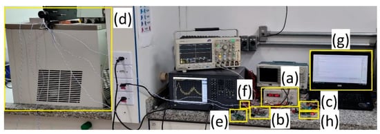 Complete system in operation for the acoustic channel formed by the combination of layers of multiple materials highlighting its main components: (a) bench power supply; (b) power amplifier; (c) outside block modem board; (d) acoustic channel in the water recipient; (e) inside block modem board; (f) pressure and temperature sensor; (g) computer displaying the transmitted data; (h) band-pass filter.