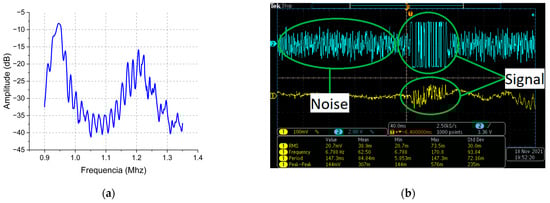 Initially, the S12 parameter of the channel was measured with a vector network analyzer (VNA), Model E5063A from HP, by connecting the transducers assembled in the system to the input and output of the VNA. This parameter measures the transmission level from one transducer to the other through the acoustic channel. Part of the energy injected in the first transducer is lost due to, among other factors, damping and differences in the acoustic impedances of the layer, which are overall measured by the insertion loss. The insertion loss of the acoustic channel is shown in Figure 8a. As can be seen, it presents a low value, with a maximum of −8.19 dB at 946.58 kHz. Due to the high insertion loss, the system was unable to operate at first. The signal at the input port of the outside block comparator is shown in Figure 8b. As can be seen, it is very noisy (highlighted by a noise label), being, therefore, a challenge to demodulate the data coming from the inside block. In order to overcome noise effects, a multiple-feedback 8th-ordered Butterworth band pass filter was used in the experiment setup. The filter parameters (45 kHz central frequency, start of rejection band at 100 kHz, maximum gain in cut-band of −40 dB and maximum band pass width of 25 kHz) were empirically fine-tuned in order to provide the adequate signal-to-noise ratio for operation. Once the signal was adequately filtered and detected, the system was stable, operating for 2 h and 30 min, with an error of 12% in data reception; the automatic gain and carrier controls were disabled during this first test.