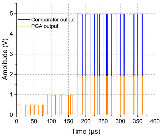 In order to assess the automatic gain control system, the circuit was initially turned on in its default configuration, with unity PGA gain. Figure 9 shows the signal at the output of the PGA, or the input of the voltage comparator, orange line, and the signal at the output of the voltage comparator of the outside block circuit, blue line. When the gain applied by the PGA was sufficient to reach the comparator voltage configured threshold, its output could saturate to indicate a high-level signal. This change can be observed in the blue line at 162.7 µs. As can be seen, the algorithm detected that the FSK-modulated signal was locked at logic zero until approximately 88.1 µs. Thus, the microcontroller (F-2) in the outside block sent an increase-gain command to the PGA, which switches from a unitary gain to a two-fold gain (at 88.1 µs), followed by a further increase to a four-fold gain (at 162.7 µs), resulting in 2 V in the output of the PGA. It is also possible to notice in Figure 9 that the comparator output signal, blue line, only follows the levels at the input when the amplitude was high enough to be detected by the comparator’s internal circuitry, which happened at 162.7 µs. Once the signal was detected, the system operated stably with the fixed gain equal to four, for 2 h and 30 min, presenting an error of 5% in the data reception. The automatic carrier control was disabled during this test.