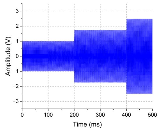 Gradual increase of carrier level. Signal sampled over the outside block transducer terminals obtained with a DSO1072B oscilloscope. It presents the increment of the output voltage on the power amplifier. The increase or decrease in the transmission carrier power is ruled by the algorithm present in Figure 3.