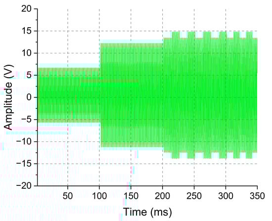 Next, the automatic carrier control was evaluated. For this test, the system was programmed to start its operation providing the smallest possible carrier amplitude, namely, 12 V and then to increase it as required by the inside block circuit. Figure 10 shows the signal at the outside block transducer (blue line), which was time zero, the moment at which circuits were energized. As soon as the system was powered up, the algorithm gradually increased the amplitude of the carrier. After some interactions, the algorithm reached an output value of carrier amplitude that was enough to energize the inside block and it started to transmit data. Figure 11 shows the last interaction of the algorithm, increasing the amplitude of the carrier. It is possible to observe that the FSK modulation pulses appear after 200 ms, indicating that the amplitude supplied by the power amplifier circuit to the outside block transducer reached a voltage level sufficient to meet the needs of the inside block circuit and it started to work accordingly.