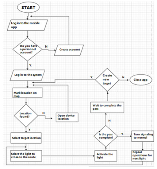 In order for the system shown in Figure 1 to work, the person using the emergency vehicle must first log in to the mobile application. The route is created after selecting the current location of the driver and the vehicle, and the target location. When the map is ready, signal lights are placed according to their location based on latitude and longitude information. A person has to select the first signal light to cross his route. In order for the selected light to turn green during the passage of the vehicle, click the “Activate” button on the control page. Here, an ON message is sent to the system to which the light on the vehicle’s route is connected. Sim808 GSM/GPRS/GPS module receives this message and transmits it to Arduino. The Arduino processes these data and controls the relay to which the lights are connected, and ensures that the light turns green during the passage of the vehicle. After the vehicle has passed, the operation of the traffic lights is normalized via the mobile application with a return to normal message sent by the driver from the mobile application.