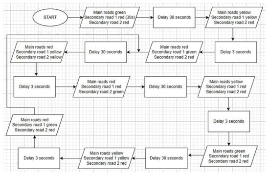 Traffic lights on main roads start with a green light. The duration of the green light is 30 s. Highways are kept green and secondary roads are kept red. In order not to interfere with the operation of the first secondary road and the operation of the second secondary road, one-time codes have been added to the codes of the first secondary road. The first operation of the first secondary road starts with these one-time codes. With these codes, it is ensured that the 1st secondary road lights are red for 30 s, yellow for 3 s, and green for 30 s. After the application of these lines of code, the first secondary road continued to operate for 70 s on red, 3 s on yellow, and 30 s on green. The operation of the system is given as a flow diagram in Figure 4. These durations were determined according to the flashing times of the traffic lights operating on the highway.