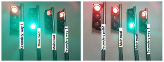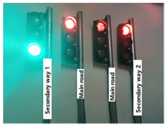 In the system, two traffic lights represent the main road; one light represents the first secondary road, and the other the second secondary road. On this type of road, the main roads cross each other while the secondary roads wait for the main roads to complete the crossing. After the main roads have completed their passage, there is a turn for the secondary roads. For example, when the first secondary road passes, the second secondary road has to wait. The sequence of traffic lights is as follows: