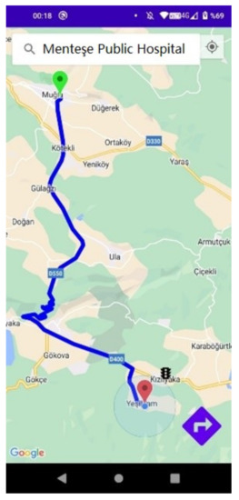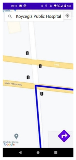 The Google Directions API is used in Android applications to create routes between two specified points. To create a route, the API key information and the latitude and longitude information of both the current location and the destination location are sent via a URL to the Google Maps Directions web service. When a new destination is entered, the previously plotted route is deleted, and a new route is created. In Figure 20, a new location is entered, and a new route is created. A close-up view of the traffic lights placed on the roads is also given by zooming in on the map.