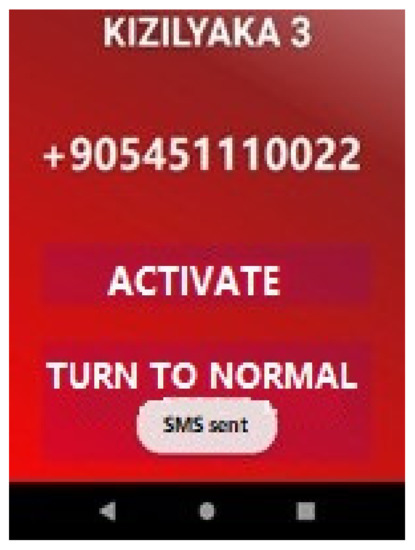 This screen contains the name of the light to be passed, the number of the module to which it is connected, and buttons to control the light. With the “Activate” button on the interface, SMS information is sent to all lights in the signaling area about what their status should be during the passage of the vehicle. The “ON” message is sent to the traffic light module that the vehicle will pass, and the “OFF” message is sent to the traffic lights in other directions. The numbers to send the message are retrieved from the database. If SMS sending is successful, the “SMS sent” information message is printed on the screen (Figure 22). When SMS sending is unsuccessful, the information message “SMS could not be sent” is printed on the screen. If there is an error with permissions, “General Error” appears on the screen; if there is no service on the phone, “No Service”; if there is a failure because a PDU (Protocol Data Unit) is not provided, “No PDU;” and if the phone has airplane mode, “Airplane Mode On” is printed on the screen.