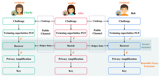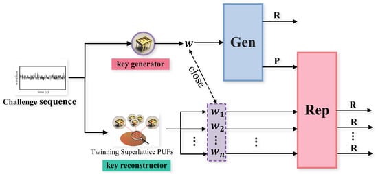 Unlike point-to-point key distribution, this paper adopts the reusable fuzzy extractor to avoid security risks caused by multiple usages of challenge sequence and helper data. A fuzzy extractor is said to be reusable if it can be used to generate the same secure key from multiple registrations of the same biometric or PUF without sacrificing the security of the system [,,]. In other words, a reusable fuzzy extractor allows users to use the same biometric or PUF for different applications or services while ensuring that each application or service has a unique and secure key. Figure 4 shows the schematic diagram for employing the reusable fuzzy extractor to obtain key agreement between multiple twinning superlattice PUFs. The key generator and each key reconstructor hold the twinning superlattice PUF based on chaos synchronization. They input the same challenge as an incentive and get similar responses. The key generator uses the Gen procedure of the reusable fuzzy extractor to produce helper data P and the random uniform string R. The key reconstructor obtains the string R consistent with the key generator through Rep procedure with the helper data P and the similar response .