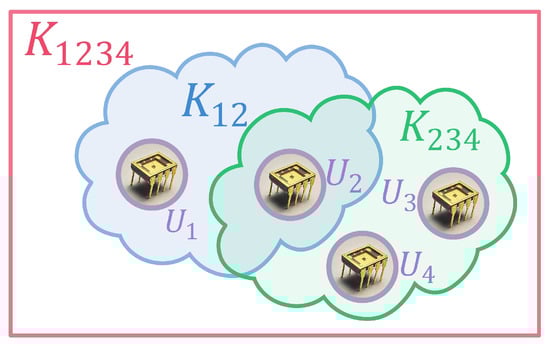 Making a subgroup key for group members who wish to communicate privately is required to prevent other members from listening to challenge and helper data. As shown in Figure 5, there has the subgroup key and group key in the secure communication group, forming a key graph []. Let represent each member node, represent the subgroup composed of and , and represents the subgroup key of user i and user j. In detail, member nodes include , , , and in the secure communication group , and they share the group key . and form a subgroup and use the key for subgroup communication among them. So are , , and . Since the superlattice PUF held by each member of the communication group has a chaos synchronization phenomenon, the challenge and helper data need to be transmitted in secret when establishing the subgroup key.