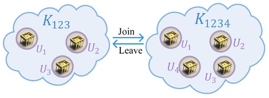 The point to remember is that the communication group may be dynamic. The group key needs to be updated to ensure that any user outside the group does not obtain the messages transmitted between the communication group, called re-keying []. Among them, the dynamic changes of the group include the joining of new members or the leaving of current members. When a new member joins the group at time t, the group updates the key to ensure that the new member cannot obtain the communication message before t, called forward secrecy. In contrast, when the current member leaves at time t, the group updates the group key to ensure that the leaving member no longer has access to communication messages after t, known as backward secrecy.