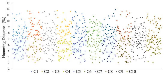 The reusable fuzzy extractor used in this paper is the digital locker based on the Sample-then-Lock proposed by Canetti et al. []. They design the first reusable fuzzy extractor without presumptions regarding the correlation between different sources. The extractor provides computational security within the digital lockers and can handle binary strings with near-linear error rates with Hamming noise. It is guaranteed that R can be fully recovered, meaning the recipient will obtain a perfectly identical copy of R, on condition that the Hamming distance between w and is less than the maximum number of correctable errors.